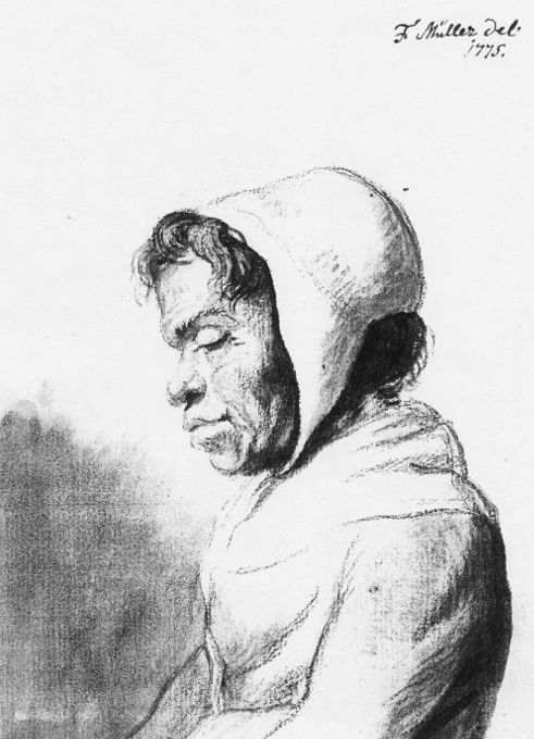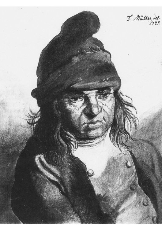 Die nun folgenden vier Jahre in Mannheim wurden zu einer Periode vielfältiger, wichtiger Kontakte zur Kunstszene seiner Zeit und einer geradezu unglaublichen Produktivität. Müller wurde in die Künstler-Akademie Mannheims aufgenommen, Kurfürst Karl Theodor, ein außerordentlicher Förderer der Künste, fand Gefallen an ihm, unterstützte ihn zunächst mit jährlichen Zuwendungen und zeichnete ihn 1777 mit dem Titel ‚kurfürstlicher Kabinettsmaler‘ aus, mit einem Titel, den der so Erhobene lebenslang gerne gebrauchte und der ihm eine bescheidene wirtschaftliche Sicherheit gewährte. In dieser Zeit entstanden eine Reihe von grafischen Arbeiten, die den starken Willen zur Naturnähe dokumentieren. Ich zeige Ihnen daraus drei Blätter, zunächst ein bäuerliches Paar in kombinierter Technik, aus Rötelkreide, Feder und Deckfarbenkolorierung. Leider habe ich nur Schwarz-Weiß-Abbildungen, die Originale wirken deutlich eindrucksvoller, so sieht man die sonnenverbrannte Haut des jungen Bauern ganz genau.