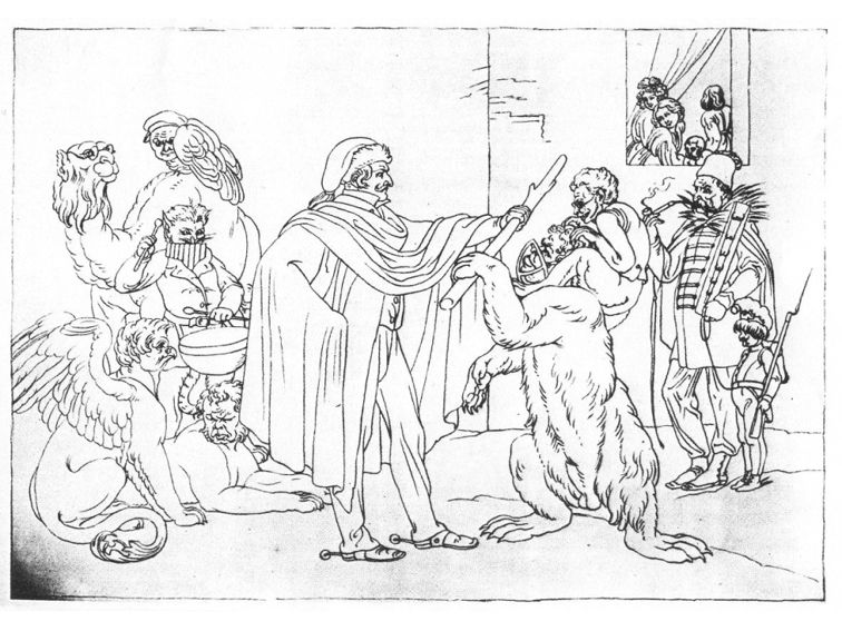 Eine karikierende Zeichnung des in Rom weilenden Künstlers Bonaventura Genelli, der Müller sehr gut kannte und ihn schätzte, zeigt den kunstbegeisterten Ludwig im Kreise seiner Künstler, die als Löwen, versehen mit ihren eigenen Häuptern um den sie beherrschenden Fürsten gelagert sind. Auch Müller, ärgerlich sich abwendend, ist in diese Szene eingefügt: