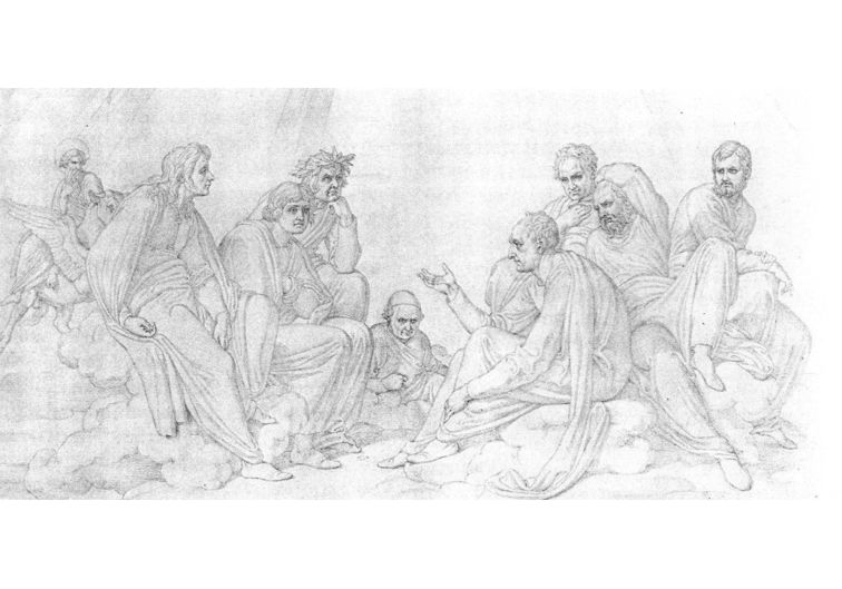 Möglicherweise wäre Friedrich Müller doch nicht unzufrieden mit seiner Grabstätte gewesen, denn er liegt dort neben der von ihm hochverehrten Schweizer Porträtmalerin Angelica Kauffmann , die 1807 in Rom gestorben und in der genannten Kirche bestattet worden ist. Der Zeichner Genelli, den wir vorhin mit seiner karikierenden Zeichnung des löwenbändigenden Kronprinzen kennengelernt haben, hat kurze Zeit nach Müllers Ableben eine Zeichnung mit dem Titel „Genossenschaft des Jenseits“ angefertigt, die ich Ihnen als letzte Abbildung noch zeigen möchte.